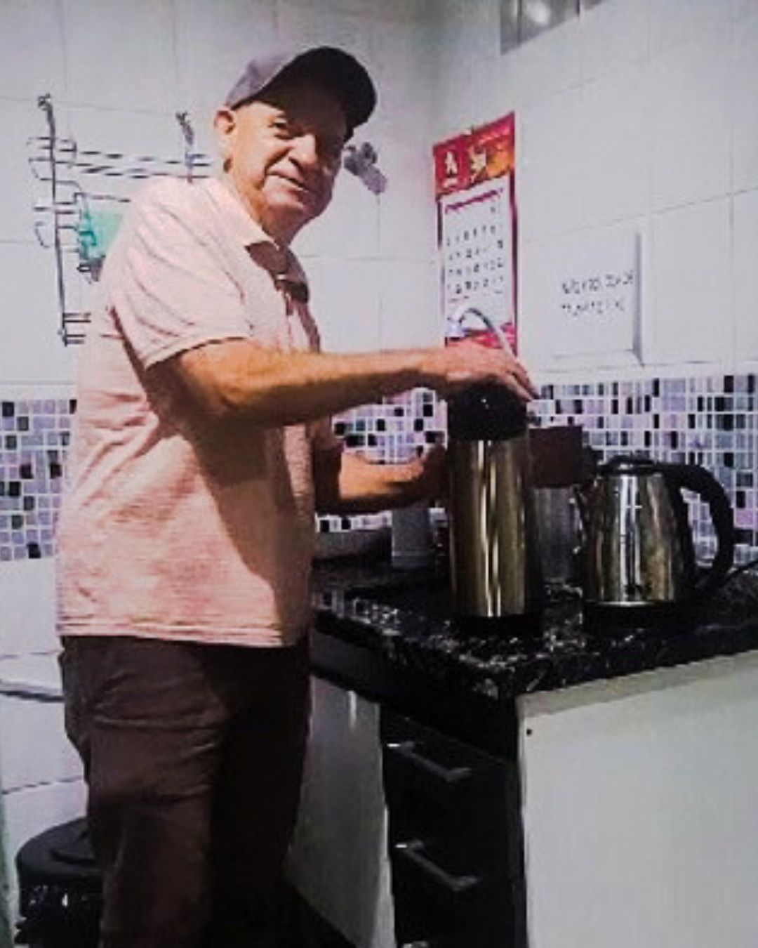 Você pode vê-lo fazendo o café para os clientes da clínica de sua filha, a neuropsicóloga e gerontóloga Claudiane Quaglia.